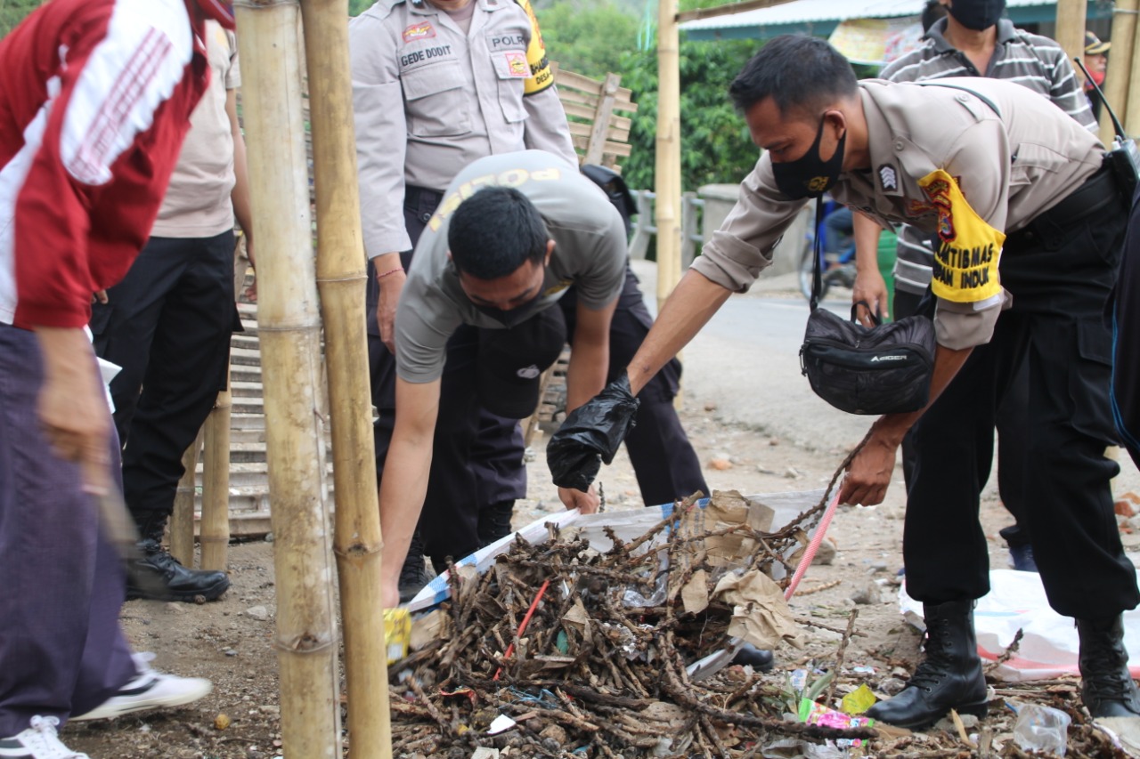 Personil polres Lombok barat bersama Pemdes Kuripan dan warga masyarakat bersama-sama melaksanakan kegiatan gotong royong membersihkan sampah di tempat umum.